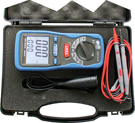 Tipo elettronico digitale a multifunzioni, con lettura su display retroilluminato, per la misurazione della resistenza di isolamento di apparecchiature elettriche, interruttori, cavi, motori, generatori con tensione di prova 250 V, 500 V, 1000 V. Funzioni supplementari selezionabili tramite commutatore: misure di resistenza, test di continuità, misurazione di tensione in corrente continua (DC) e alternata (AC) e prove equipotenziali. Indicatore livello carica batteria. Funzione Data Hold. Capacità di misurazione test di isolamento: 0,1 Mohm fino a 2000 Mohm. Precisione: 0,1-200 Mohm ±3% + 5 digit (250 - 500 V) 1-2000 Mohm ±5% + 5 digit (1000V) Corrente di prova: < 200 mA (DC). Quando la resistenza è inferiore a 40 ohm si attiva un segnale acustico. Misurazione di tensione: 0-1000 V in DC 0-750 V in AC Precisione: ±1% + 3 digit in DC ±1,2% + 10 digit in AC Alimentazione: 6 batterie alcaline da 1,5 V tipo AA (Art. 3600 E), in dotazione. Con 2 puntali di misurazione e 1 cavo di massa.