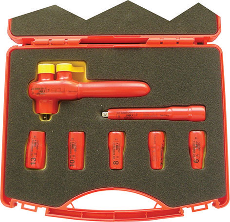 Utensili in acciaio temprato. Impugnatura a forte spessore, rossa, isolata fino a 1000 Volt con marchio di prova VDE, IEC 60900, dove indicato. Le pinze e i tronchesi hanno doppio rivestimento, interno giallo, esterno rosso.