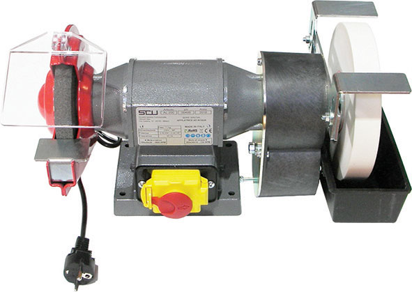 Tipo da banco per uso professionale con mola a bagno d'acqua a velocità di rotazione ridotta che permette di ottenere affilature a rasoio di lame, coltelli, scalpelli, sgorbie, ecc. in acciaio, acciaio SUPER-RAPIDO e INOX. Motore chiuso e protetto da infiltrazioni. Alberi su cuscinetti a sfera, 1 mola per smerigliare e 1 mola per affilare dotate di protezione antinfortunistica. Motore monofase V 230/50 Hz.