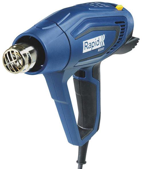 Tipo professionale a pistola per molteplici impieghi, sverniciare, scollare, piegare e per apporto di materiali vari. Robusto, compatto, morbido da impugnature, ergonomico, con protezione per la mano. Possibilità di appoggio in posizione verticale. Triplo stadio di riscaldamento 60/350/600°C. Erogazione d'aria da 250 a 500 l/min. V 230. Potenza W 2000. Senza accessori.