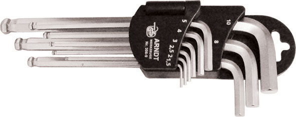 Tipo con SFERA MAGNETICA per la tenuta della vite. In acciaio CROMO-VANADIO. Con estremità a sfera per uso inclinato fino a 30°, l'altra estremità per uso normale. Esecuzione cromatizzata. Esagoni in millimetri.