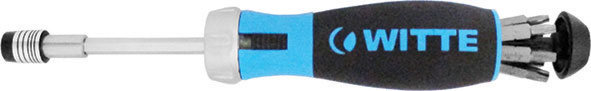 Tipo a cricco per uso D+S e fisso con 6 inserti assortiti nell'impugnatura. In acciaio al CROMO-VANADIO. Con attacco esagonale per inserti da 1/4". Impugnatura anatomica antiscivolo, ottenuta mediante la combinazione di materiali plastici rigidi e morbidi. Apertura del magazzino dei bits mediante tasto zigrinato, da arretrare, posto nell'impugnatura. Con magnete supplementare posteriore. Ghiera scorrevole e molla per il cambio rapido dei bits. Lunghezza totale mm 215.