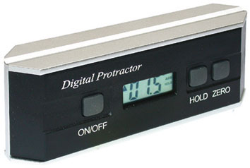 Corpo in alluminio con superfici d'appoggio di precisione. Lettura diretta sul display di grandi dimensioni di tutti gli angoli fino a 360° (4x90°). Azzeramento automatico. Tasto di memoria dei dati. Lettura: 0,1°. Precisione: 0,2° fino a 15°, 0,5° da 15° a 90°. Dimensioni mm 150x30x60h. Alimentazione con 2 batterie alcaline 1,5 V tipo AAA, Art. 3600 C, in dotazione.