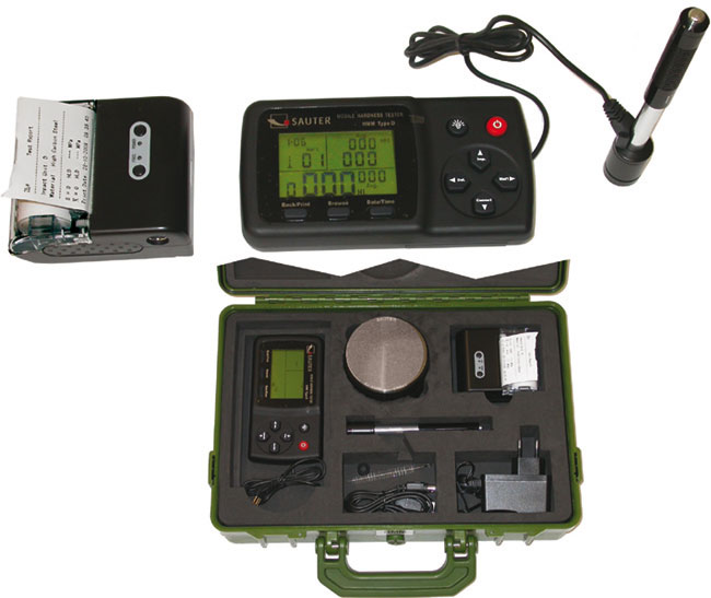 Tipo digitale con ampio e chiaro display multifunzione per misurare la durezza di acciai, ghise, alluminio, materiali non ferrosi. Trasportabile per la massima flessibilità e mobilità d'uso, con sensore a rimbalzo, separato, che permette semplici misurazioni anche in posizioni di difficile accesso. Utilizzo in tutte le direzioni (360°) con compensazione automatica dell'angolo. Conforme alle norme ASTM A-956 e DIN 50156. Permette misurazioni con visualizzazione in scala Leeb (HL) con conversione automatica in scala Rockwell (B e C), Vickers (HV), Brinell (HB), Shore (HSD) e resistenza alla trazione (MPa-Ob). Permette statistiche con visualizzazione dei valori assoluti, del valor medio (fino a 9 rilevazioni), differenze tra valore minimo e massimo (tolleranza), ora e data, con stampa immediata dei dati rilevati su stampante a collegamento a raggi infrarossi (senza cavo), fornita in dotazione. Per oggetti piani, concavi/convessi con raggio superiore a mm 10 (utilizzando l'apposito anello di stabilizzazione), superiore a mm 50 (senza anello), con spessore superiore a mm 8 e massa superiore a Kg. 3. Funzionamento con 3 batterie alcaline V 1,5 (tipo AAA - Art. 3600 C), in dotazione. Funzione di spegnimento automatico e indicatore di livello carica batterie. Fornito in robusta valigetta di trasporto, completo di campione di calibratura.