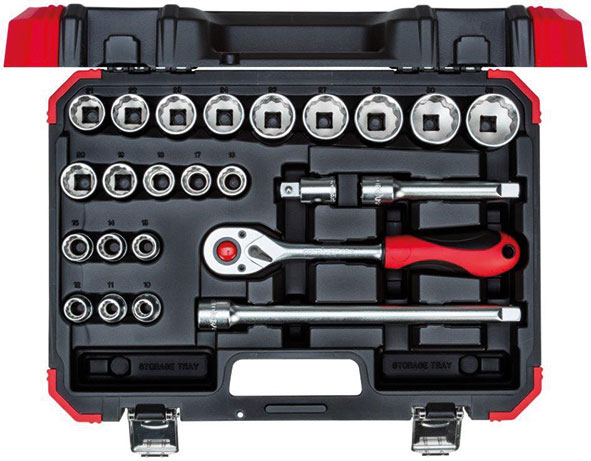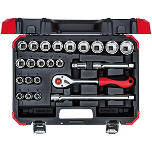 Contenuto 24 utensili. Composizione: 20 bussole poligonali da mm 10 - 11 - 12 - 13 - 14 - 15 - 16 - 17 - 18 - 19 - 20 - 21 - 22 - 23 - 24 - 26 - 27 - 28 - 30 - 32 1 leva a cricco con levetta a sgancio rapido 2 prolunghe fisse da mm 125 - 250 1 adattatore scorrevole attacco quadro da 3/8" a 1/2" Assortimento completo.